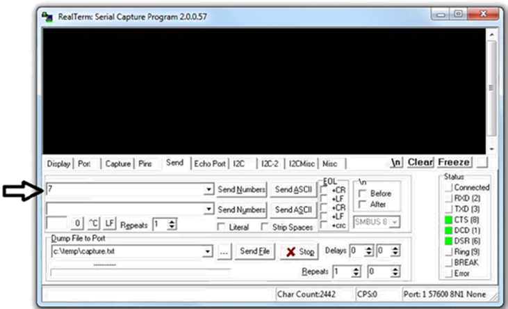 Sending bytes using RealTerm: Click on the Send tab, type a number and click Send Numbers/Send ASCII. If you input, say 20 there and press Send Numbers, it will send 0x14. You can also enter directly as hexadecimal 0x14 and press Send Numbers.
