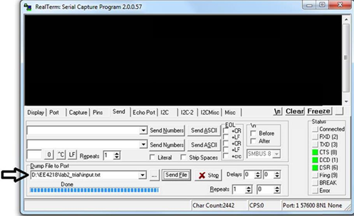 Sending text file contents using RealTerm: Specify the file in the Dump File to Port and click Send File.